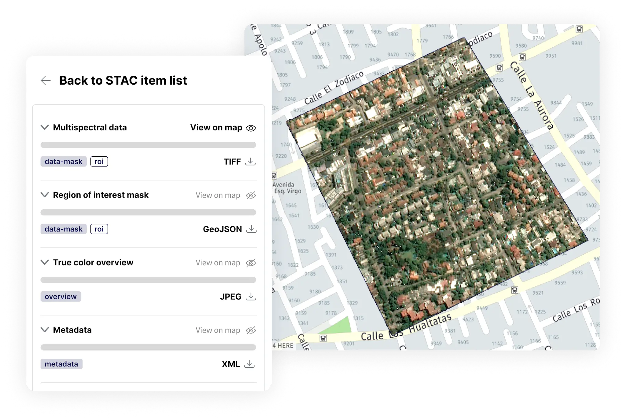 Support search/filtering by Product, Order, AOI, and metadata.